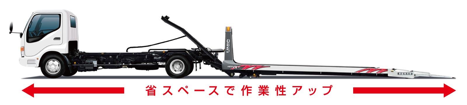 荷台スライド装置には、ユニックが長年培ってきた「全工程シリンダ」を継承するとともに、ユニッククレーンで培われたブーム順次作動方式(シリンダ順次作動方式)を採用。各ストローク エンドでのシームレスな順次作動はまさにスーパースムース。全工程シリンダならではの耐久性・メンテナンス性も万全。