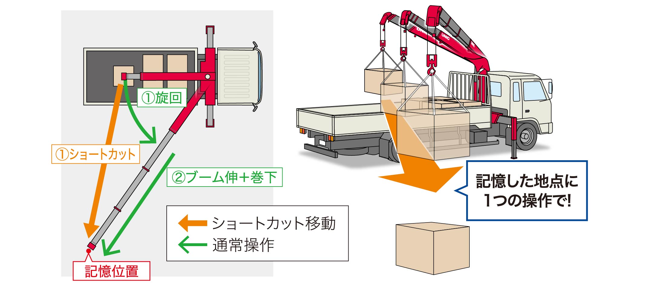 フックの位置を記憶。1つの操作のみで記憶した地点まで最短距離で移動でき、作業時期が短縮できます。