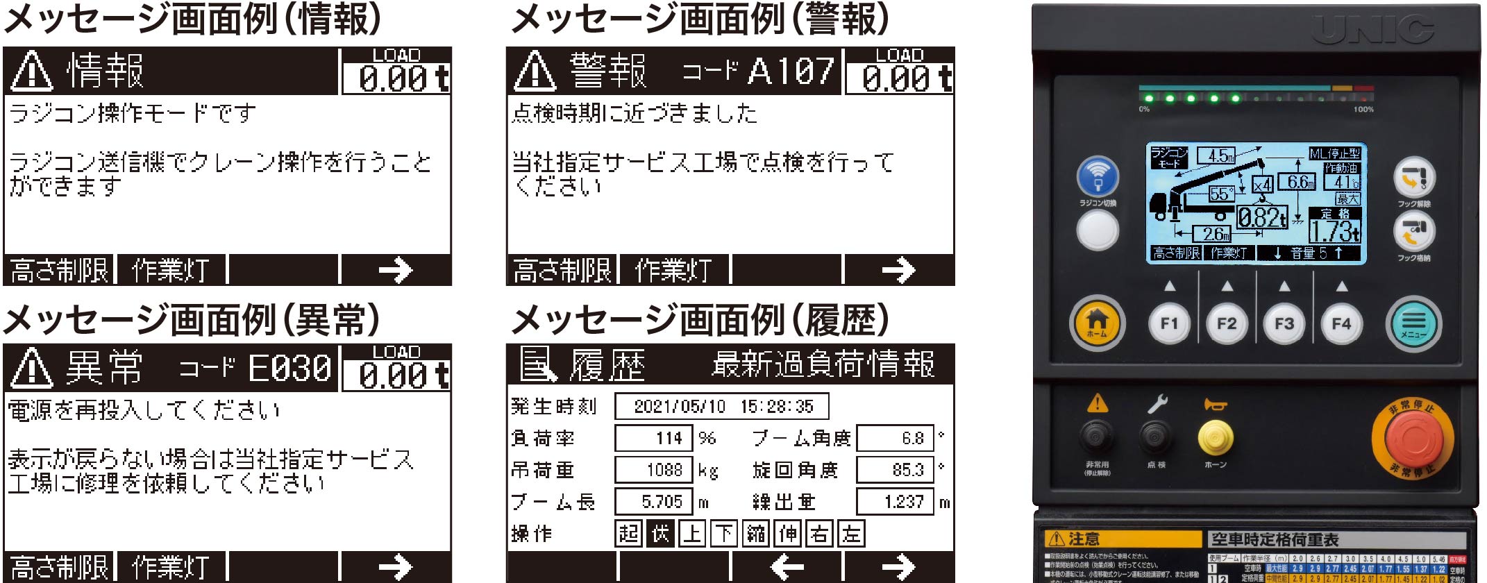 各種情報表示やモード設定はもちろん、エラーコードの解説や解除手順を順を追って案内。クレーンの状態を把握することでトラブルを防止しながら、迅速な作業を可能にします。